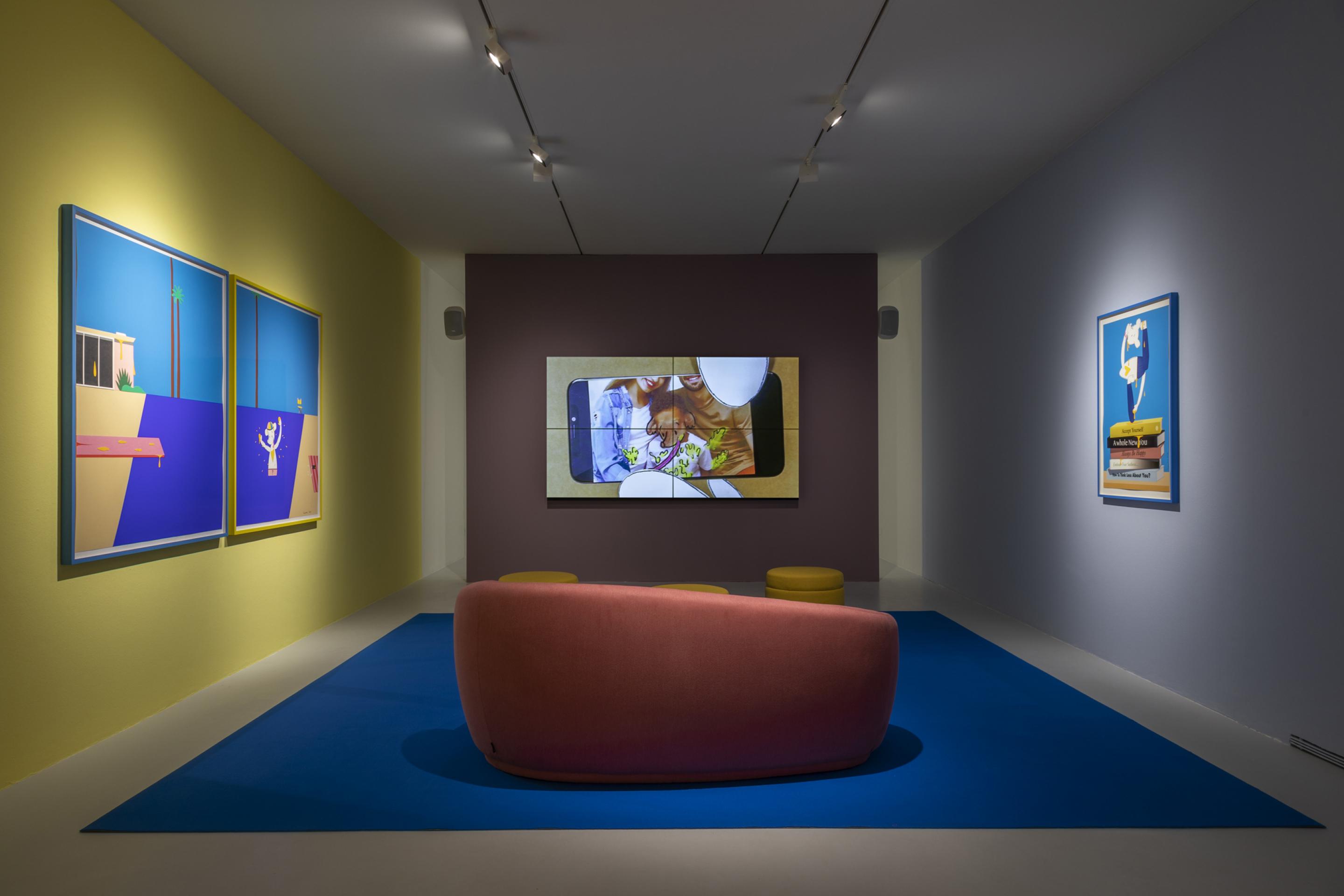 Who the Baer was developed by the artist during the first pandemic lockdown as a ‘Dada-esque response to an increasingly absurd and incomprehensible world.’ Faced with the seemingly unresolvable questions raised by global protests and the dissolution of our traditional identity structures, Fujiwara created an avatar in the form of an identity-free cartoon character named ‘Who’ – a white, fuzzy bear with a golden heart and an impossibly long tongue. Who, as they are lovingly known, seemingly has no race, no gender, no sexuality and not even a clear design – only one thing is clear: that they are an image moving through a world of other images, and as such they have the unique ability to shape shift and perform any identity they wish. But will Who ever find a true, authentic self? Indeed, does a cartoon character even want to be authentic when it might be enough for them simply to appear to be authentic?